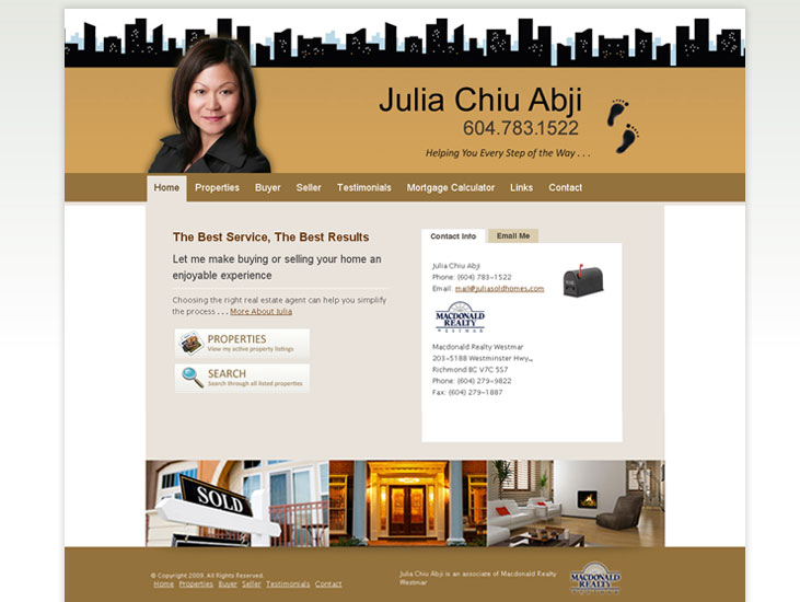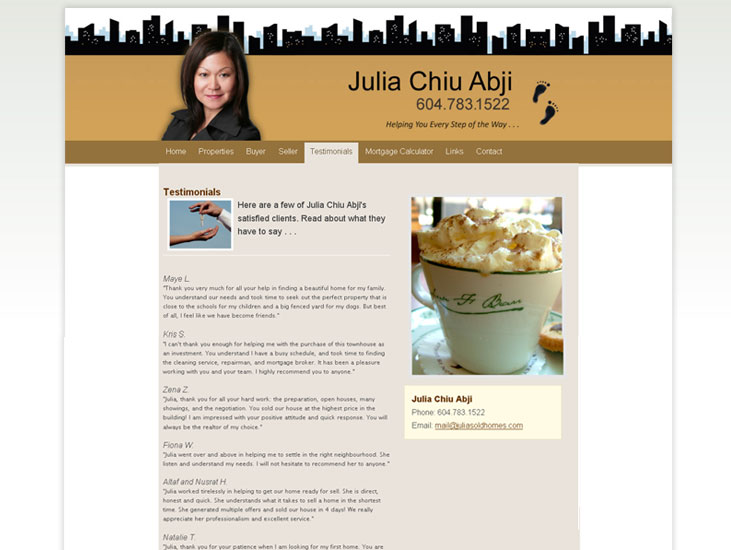 Julia wanted a website that would fit in with her existing brochures and flyers. She approached me with a goal of having a website up and running in 3 days as she has already sent out flyers with her website address printed on them. I was able to achieve that goal (with a few setbacks, not my fault) and had a finished product in less than a week.